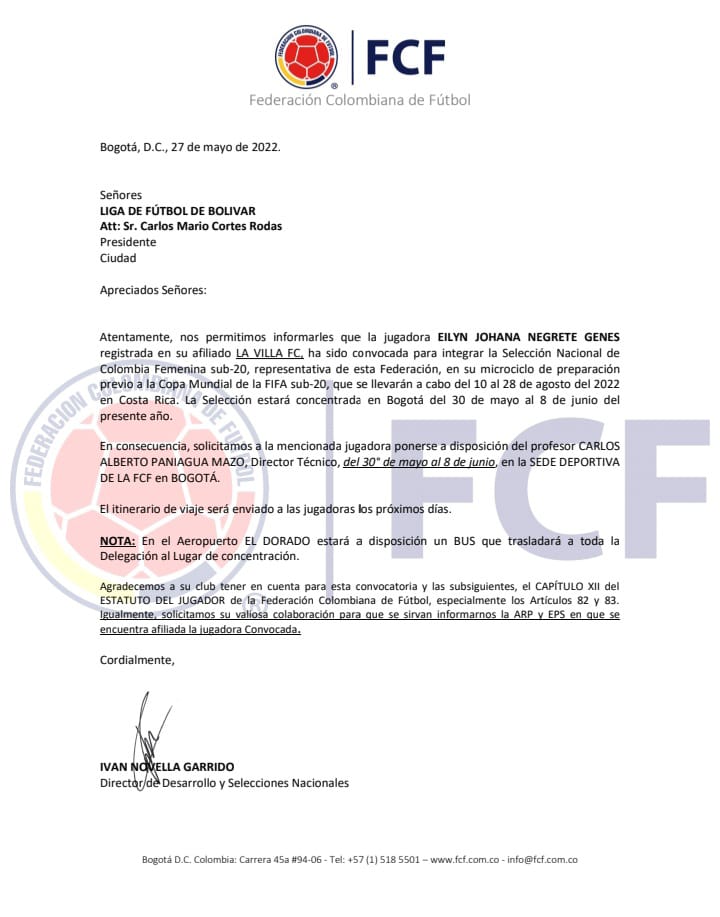 La cartagenera, actual jugadora del Club La Villa FC, fue convocada por el profesor Carlos Paniagua para hacer parte de la Selección Nacional de Colombia sub 20, en su microciclo de preparación previo a la Copa Mundial de la FIFA a realizarse en Costa Rica del 10 al 18 de agosto.