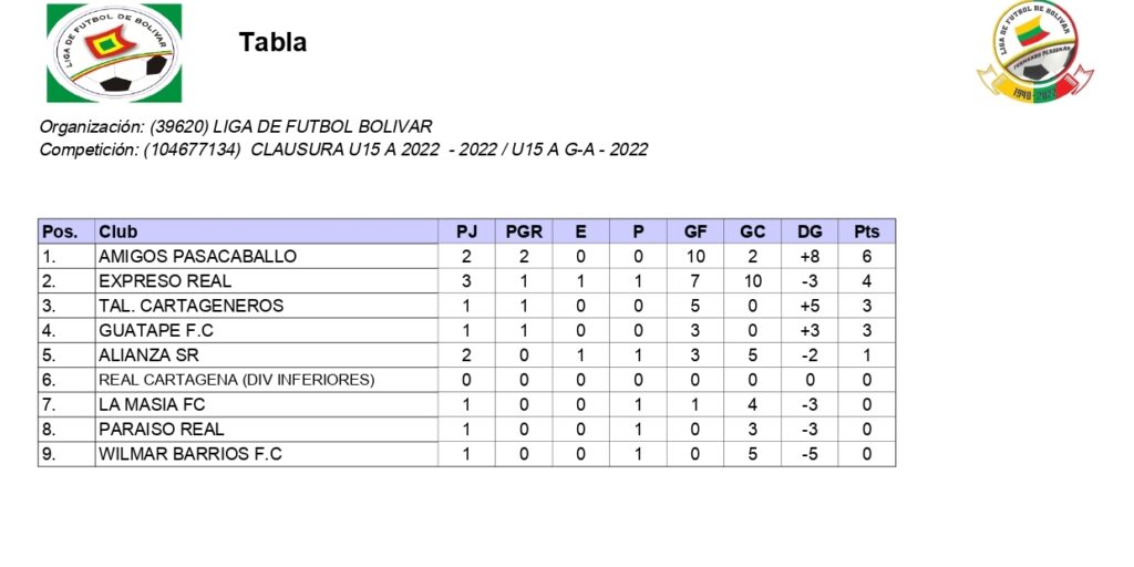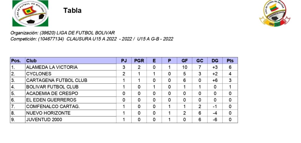 Tablas de pocision U15 B grupos A, B y C